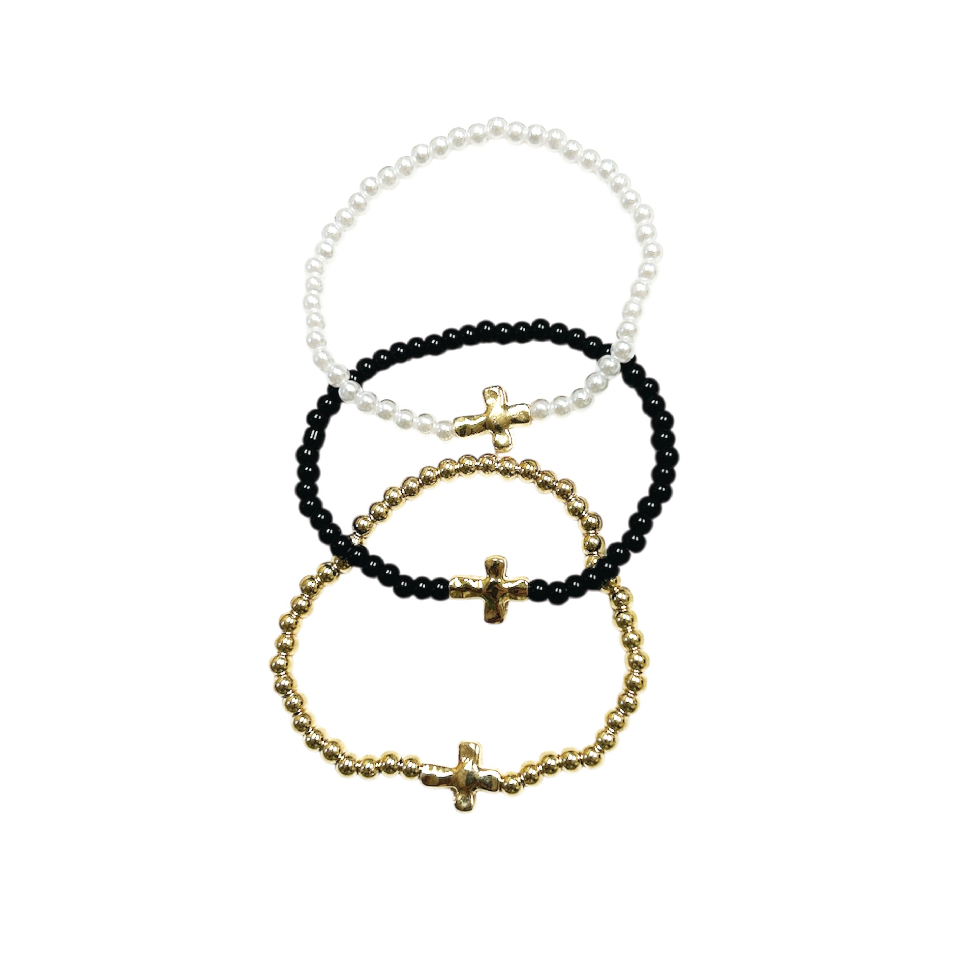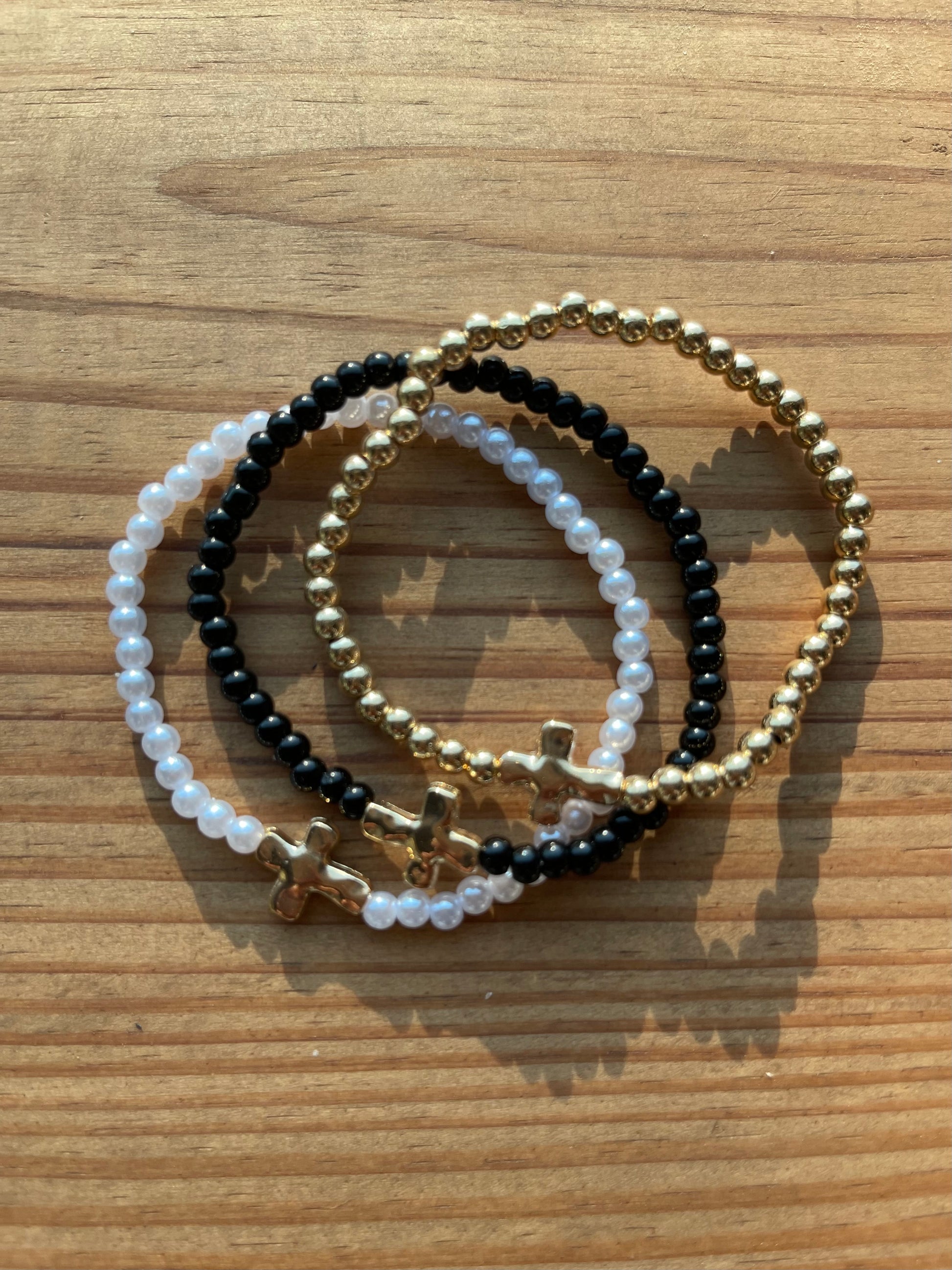 Set of 3 bracelets in pearl, gold & black with cross pendant - one size